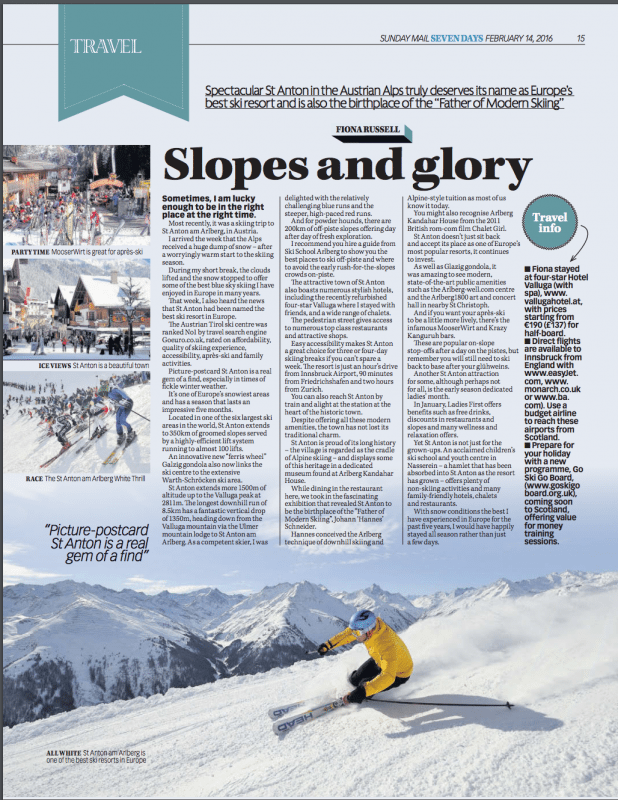 I know, I know. I am very spoilt this year when it comes to skiing. I am just back from a two-week trip to America. While I was away this travel feature about skiing in St Anton, Austria, was published in the Daily Record/ Sunday Mail. St Anton is a superb place for easy access European skiing.