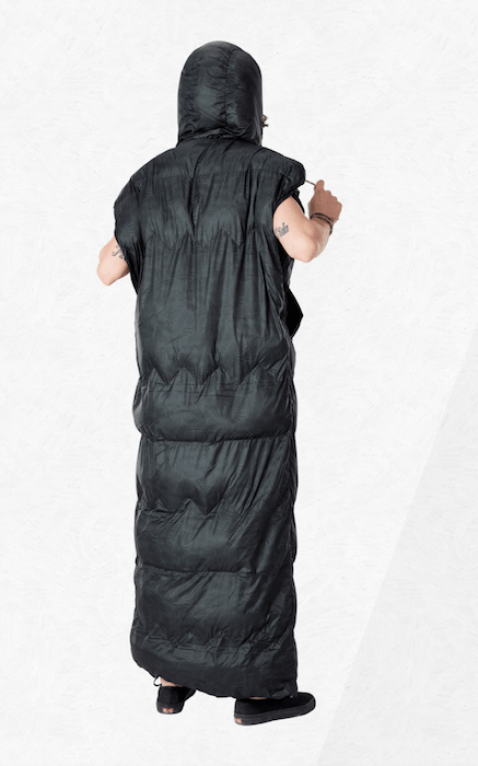 It can be worn as a jacket or zipped up as a sleeping bag. It has zipped sides and lower hem to allow arms and feet and arms outside of the sleeping bag. It also has an adjustable hood.