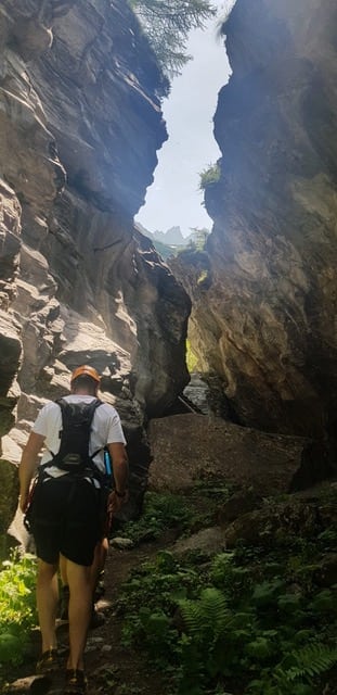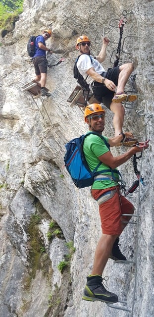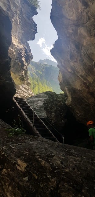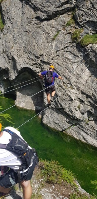 The Via Ferrata, which comprises a series of rope bridges, carved steps and ladders over a total length of 600 metres, is located in the Mauvoisin Gorge, high above the River Dranse.