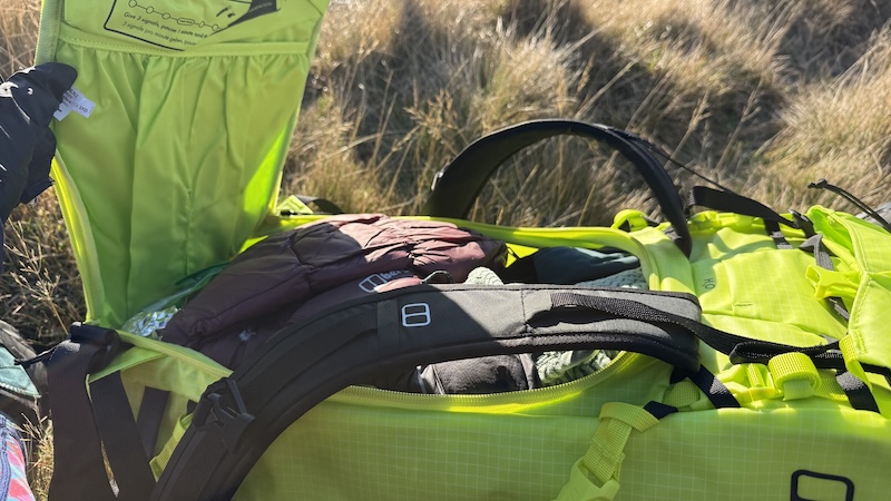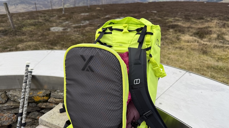 The pack feels comfortable when laden and on my back. The back system is described as having “a breathable back panel with a 10mm hypercushion spacer mesh, covered with hardwearing monomesh flat nylon to offer moisture management, padding and abrasion resistance without the risk of snow build-up”. Basically, this is a padded panel that looks and feels durable. It works well. I am not sure it is very breathable but that is difficult to test when using it in wet or cooler conditions. I haven’t noticed my back being overly sweaty.