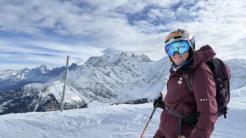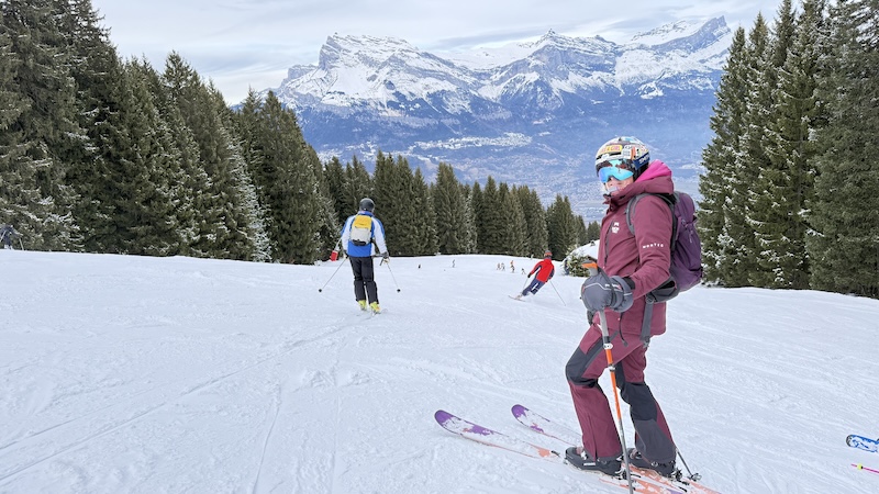 I tested Montec’s Fawk women’s ski jacket and bib pants during a week’s skiing in the French Alps. The weather was a mix of cold, sunny and snowy, as you might expect in January. I wore the ski jacket and bibs for a week of downhill skiing, using gondolas, chairlifts and T-bars, as well as for a morning’s “skin up” on a ski randonnée route. I wanted to see how the jacket and pants performed in different conditions and while doing a variety of activities. Here are my thoughts.